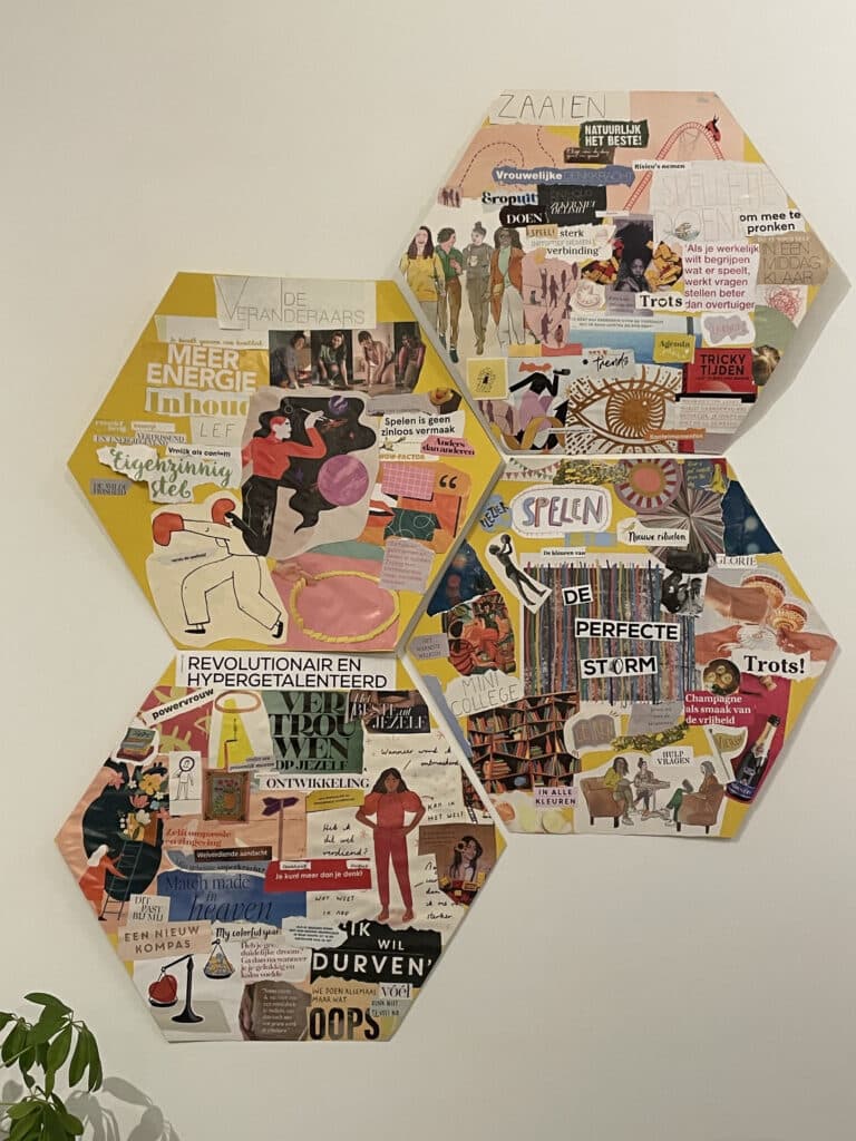 Uit een dikke stapel tijdschriften scheurden we eerst de leukste foto’s en quotes. Daarna gingen we aan de slag met clusteren: welke thema’s kunnen we hieruit halen?
