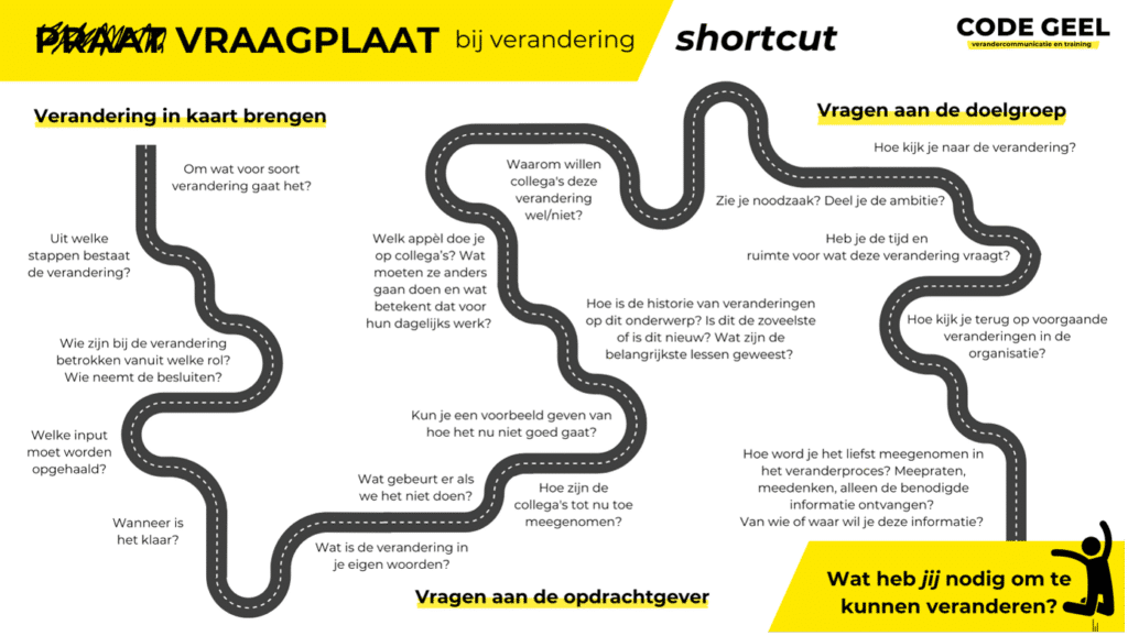 Staat er in 2026 een grote verandering voor de deur bij jouw organisatie of bij jouw opdrachtgever? Deze plaat helpt je de juiste vragen te stellen! Zo krijg je de verandering goed in kaart, krijg je het vraagstuk helder bij de opdrachtgever en misschien wel het belangrijkste: je weet wat je doelgroep nodig heeft om mee te veranderen.